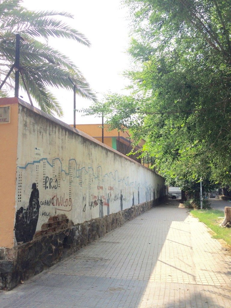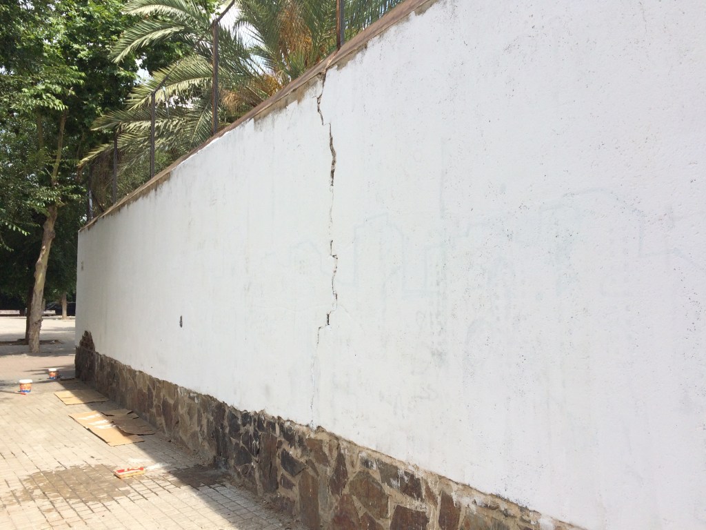 A tan sols un dia de que arribin els grups de joves que participaran del Recrear, investigar, experimentar i viure l’espai públic, quedem amb l’equip de projecte ICI per emblanquinar la paret de l’escola Lestonnac. Durant el juliol, una nova capa d’història i de colors.