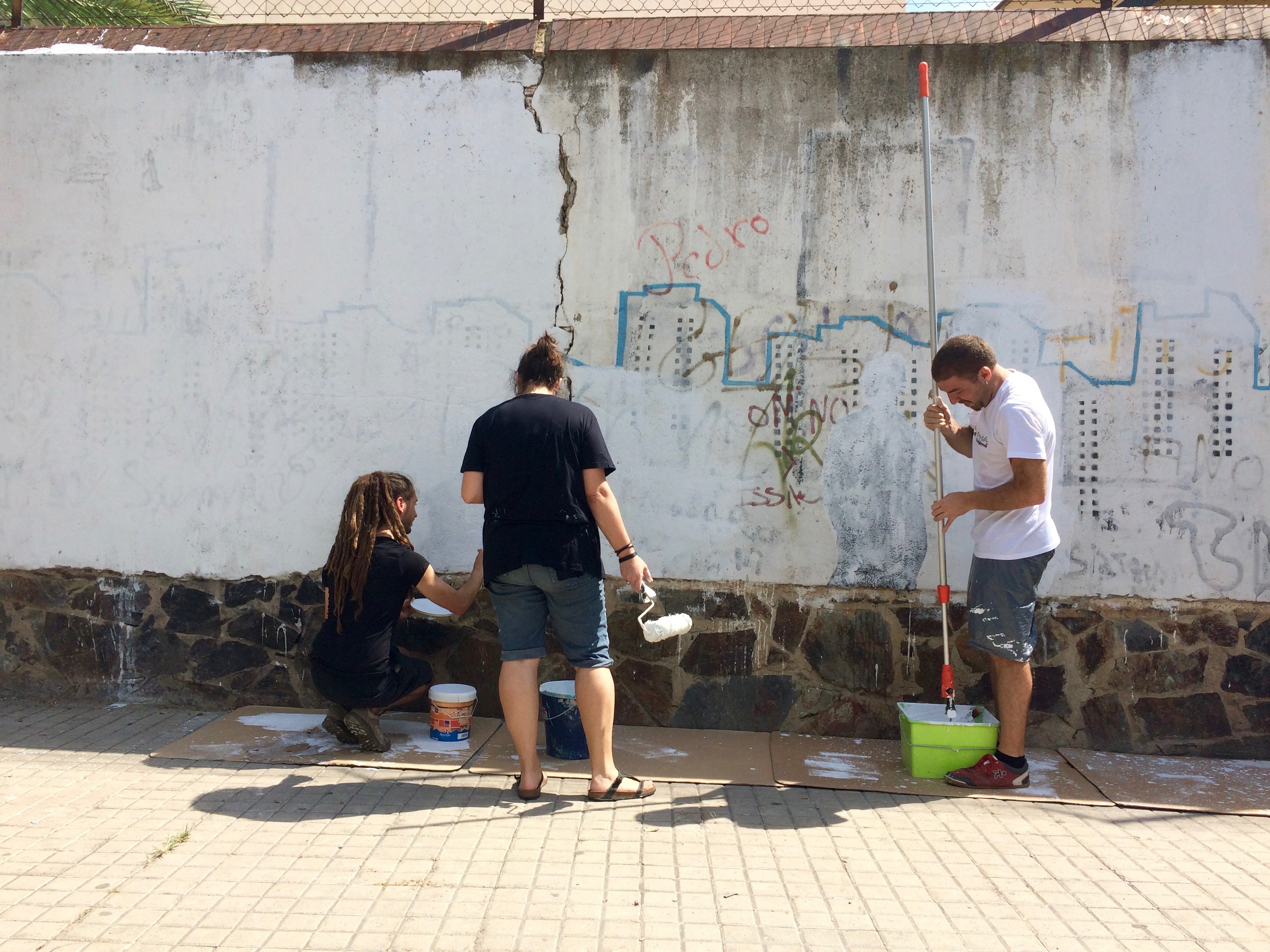 A tan sols un dia de que arribin els grups de joves que participaran del Recrear, investigar, experimentar i viure l’espai públic, quedem amb l’equip de projecte ICI per emblanquinar la paret de l’escola Lestonnac. Durant el juliol, una nova capa d’història i de colors.