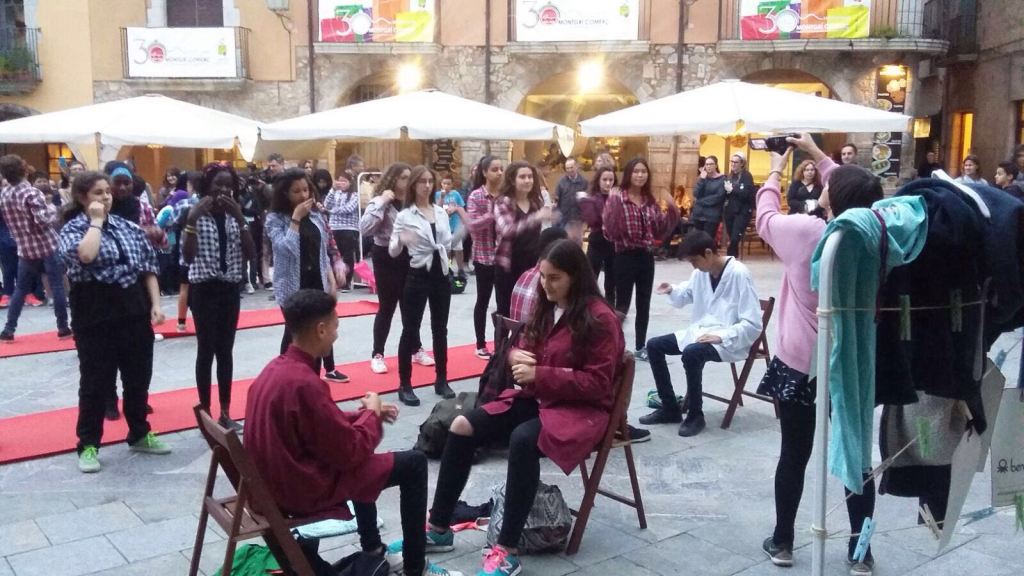 El dia 13 vam passar a l’acció. No més fashion victims va soritr al carrer per compartir els aprenentatges i el missatge amb la resta de companys i companyes de l’institut i la ciutat. Malgrat l’amenaça de pluja, la plaça de la Vila va esdenir un escenari nou, modificat per la intervenció dels nois i les noies que van ocupar l’espai públic de la seva ciutat amb art, imaginació i reivindicació. Si vols saber amb més detall com va anar la performance pots llegir la crònica del dia 13 de maig: performance a la plaça de la Vila